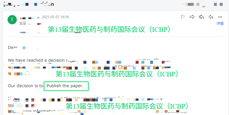 编号S**0**06论文已被第13届生物医药与制药国际会议(ICBP) 成功推荐至SCI发表;